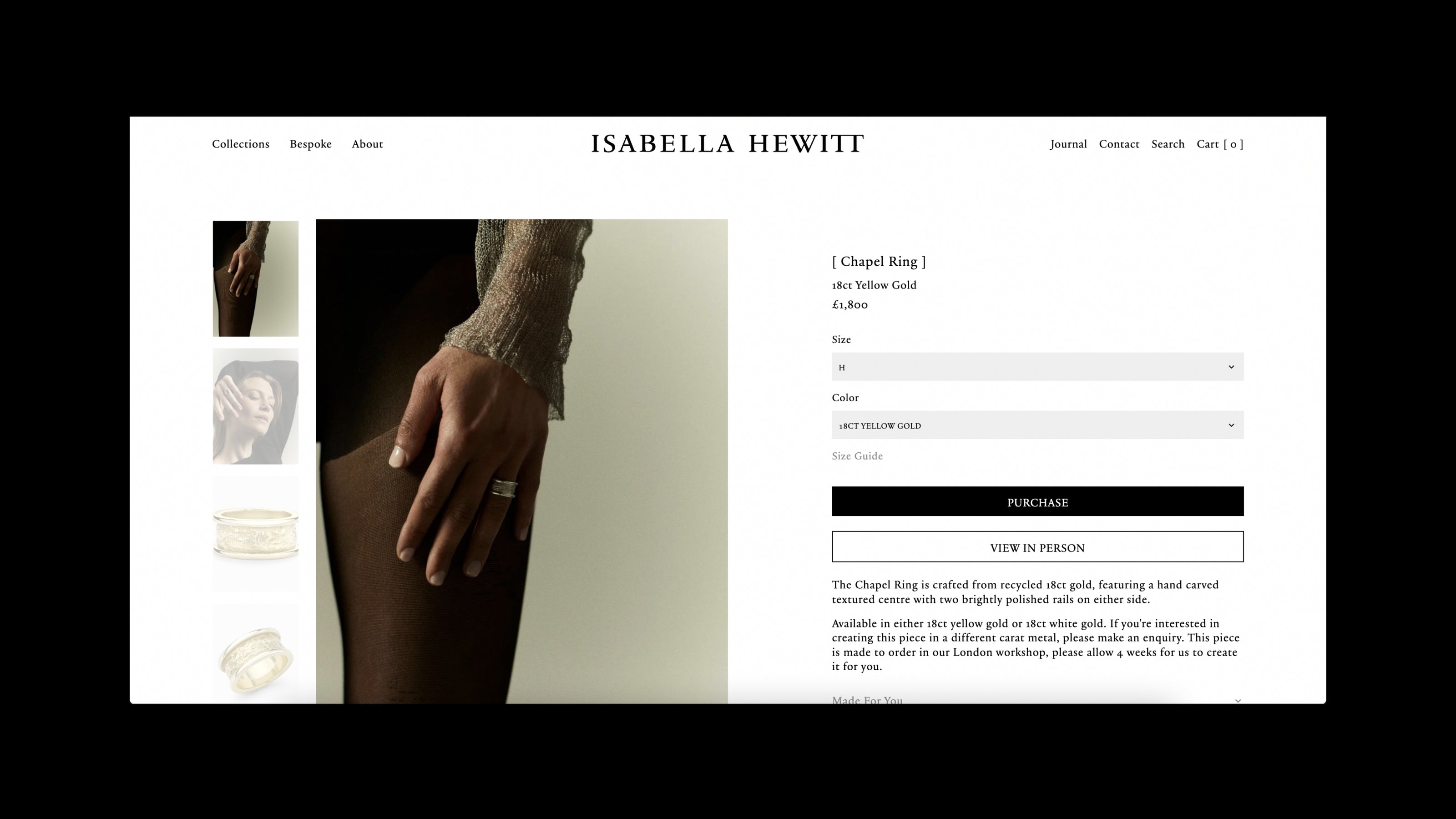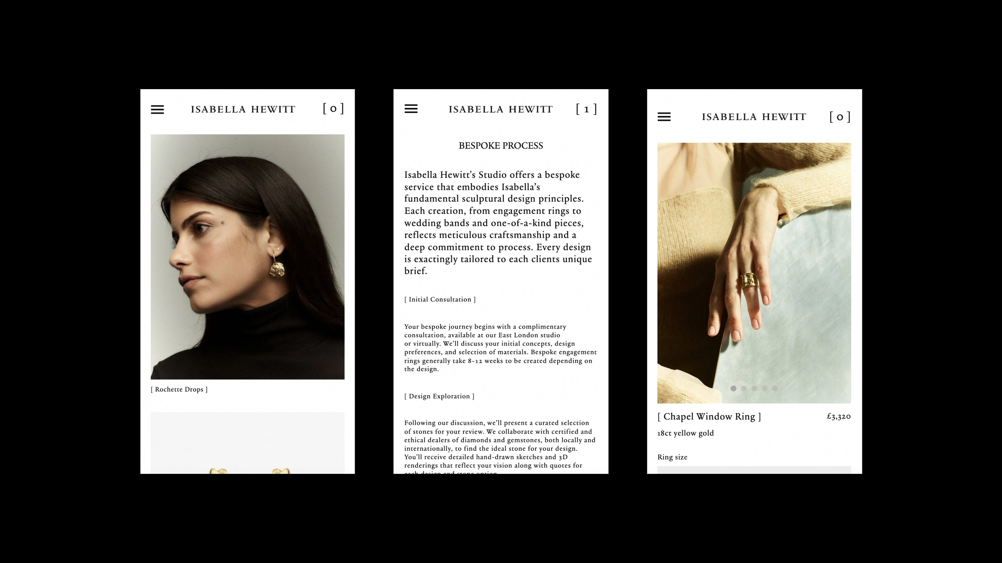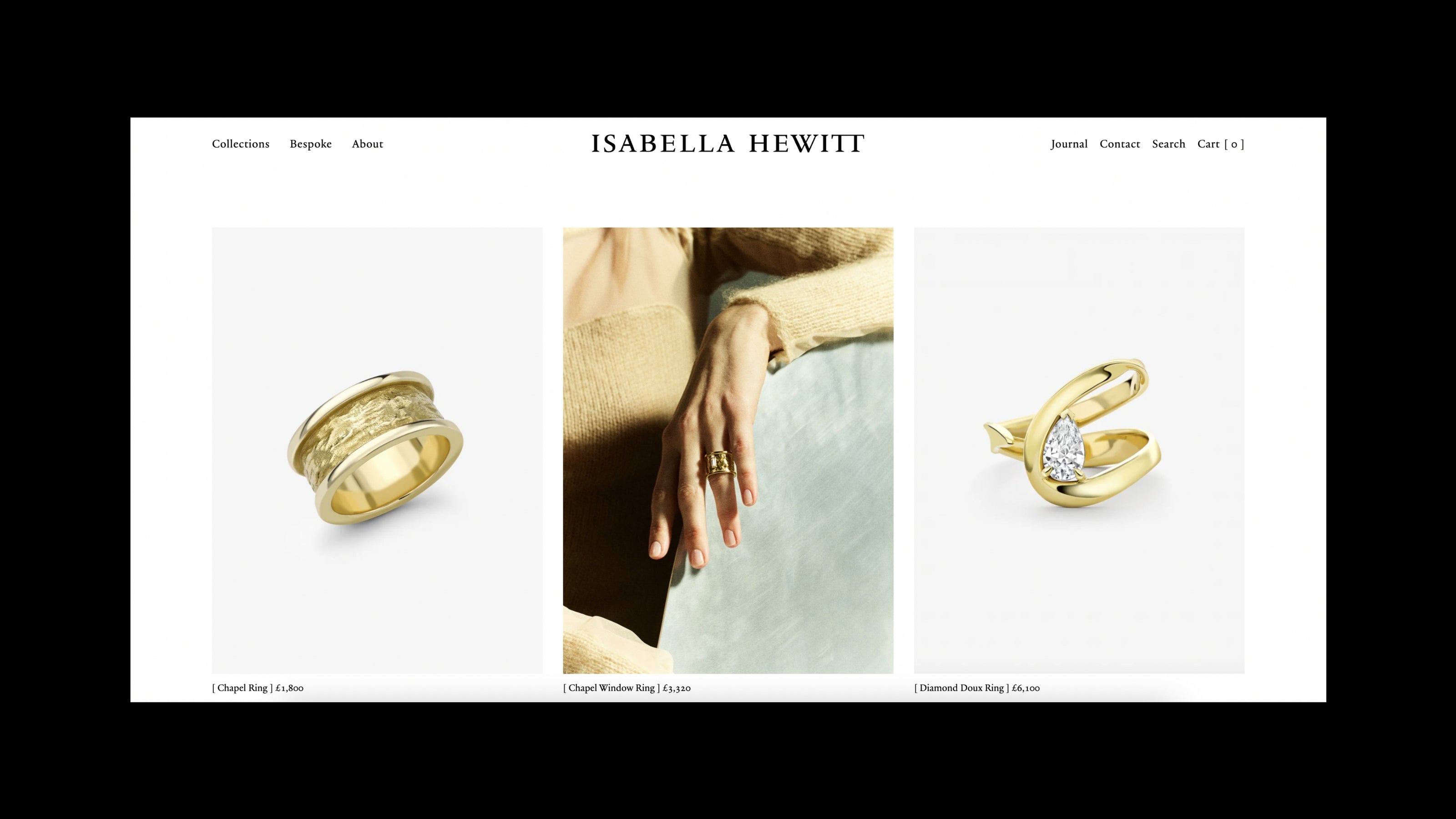 A jewellery brand with a vision to create distinctive products that stand out in a crowded industry, Isabella Hewitt required a website that would seamlessly blend e-commerce functionality with a design vision centred on the founder's unique background.