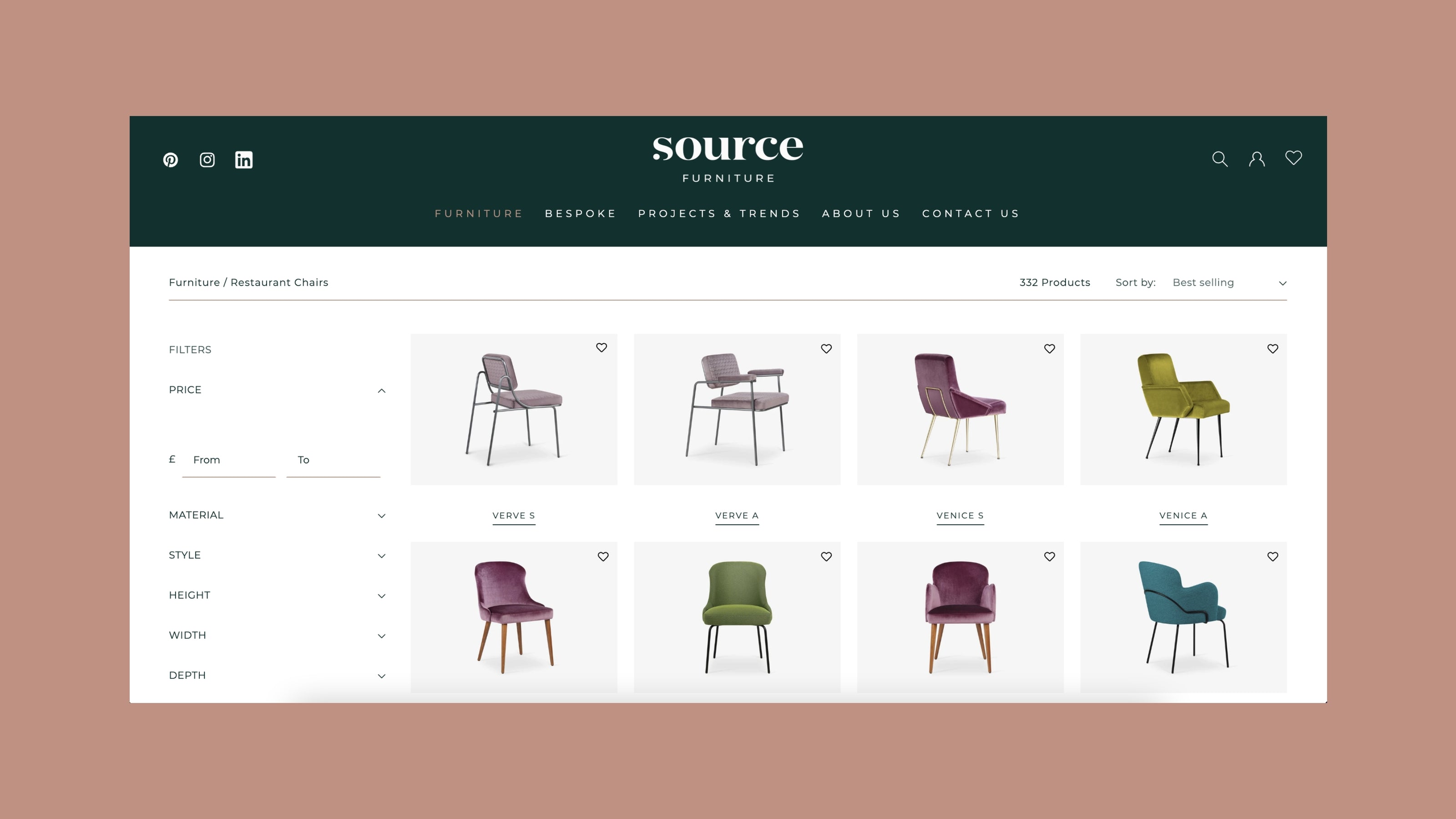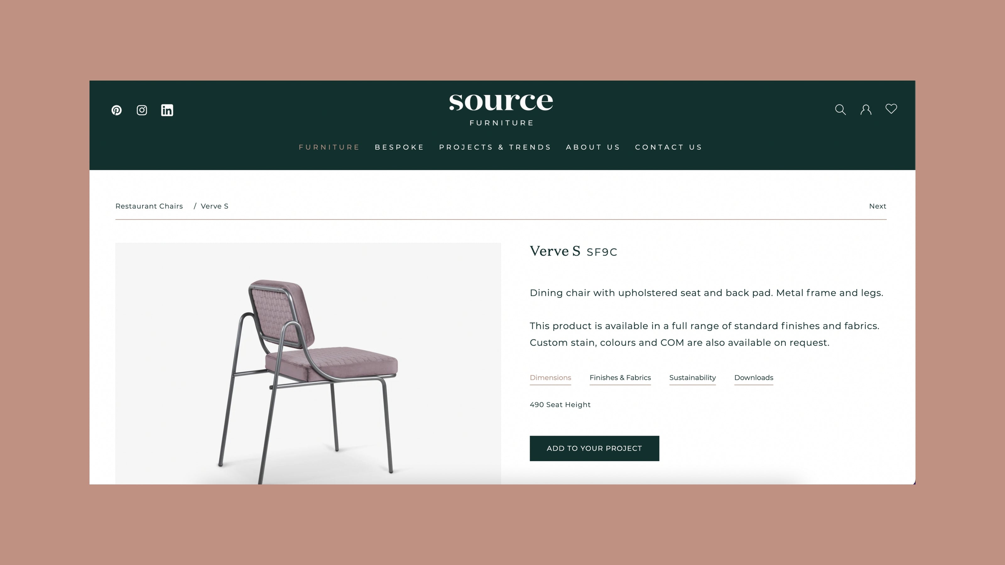 Based in west London, Source Furniture is a small team of experienced contract furniture experts. As an established wholesaler serving hospitality brands across the UK and Europe, it was essential to showcase the extensive collections and expertise of the brand during its migration to the Shopify platform.